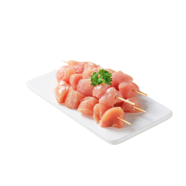 Diced chicken breast threaded on a bamboo skewer and marinated in a BBQ sauce.